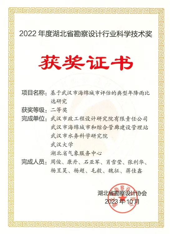 依托城市內(nèi)澇防治與水環(huán)境流域治理技術(shù)中試平臺(tái)開展的《基于武漢市海綿城市評(píng)估的典型年降雨比選研究》獲湖北省勘察設(shè)計(jì)協(xié)會(huì)科學(xué)技術(shù)二等獎(jiǎng)