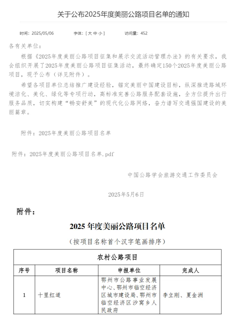 ? ? 近日,中國公路學(xué)會正式公布“2025年度美麗公路項目”名單,武漢市政院設(shè)計的鄂州市臨空經(jīng)濟(jì)區(qū)沙窩鄉(xiāng)“十里紅道”憑借紅色文化傳承與生態(tài)環(huán)境融合的卓越理念,成功躋身全國150個標(biāo)桿項目之列。