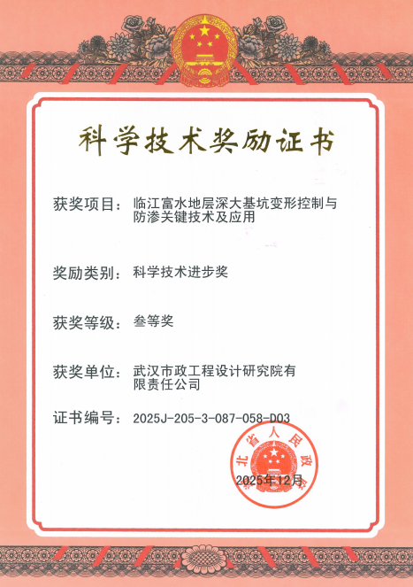 近日,2025年度湖北省科學(xué)技術(shù)獎(jiǎng)獲獎(jiǎng)名單正式公布。由武漢市政院深度參與研發(fā)的科研項(xiàng)目“臨江富水地層深大基坑變形控制與防滲關(guān)鍵技術(shù)及應(yīng)用”,憑借顯著的技術(shù)創(chuàng)新性與突出的工程應(yīng)用價(jià)值,榮獲湖北省科學(xué)技術(shù)進(jìn)步三等獎(jiǎng)。