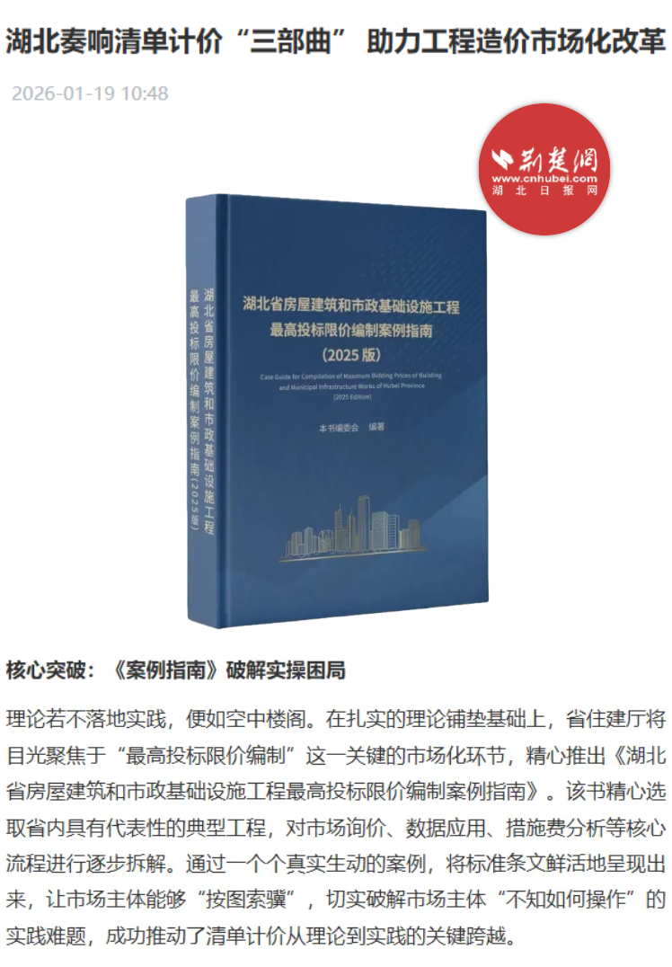 隨著《湖北省建設(shè)工程工程量清單計(jì)價(jià)指引(2026)》《湖北省園林綠化工程投資估算指標(biāo)(試行)》《湖北省房屋建筑和市政基礎(chǔ)設(shè)施工程最高投標(biāo)限價(jià)編制案例指南》以及《建設(shè)工程工程量清單計(jì)價(jià)(GB/T 50500—2024)及計(jì)算標(biāo)準(zhǔn)應(yīng)用與實(shí)務(wù)》等一系列規(guī)范與專著的陸續(xù)發(fā)布,湖北省圍繞國家標(biāo)準(zhǔn)《建設(shè)工程工程量清單計(jì)價(jià)標(biāo)準(zhǔn)》(GB/T 50500—2024)構(gòu)建的“理論解析—實(shí)操示范—規(guī)則指引”三位一體清單計(jì)價(jià)體系已正式形成,標(biāo)志著湖北省工程造價(jià)行業(yè)邁入市場(chǎng)化、規(guī)范化發(fā)展的新階段。近日,荊楚網(wǎng)與湖北日?qǐng)?bào)網(wǎng)專題刊登了題為《湖北奏響清單計(jì)價(jià)“三部曲”助力工程造價(jià)市場(chǎng)化改革》的報(bào)道。