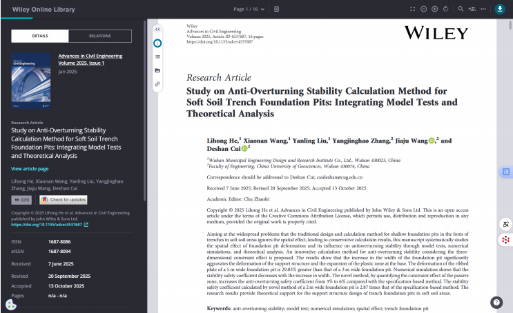 《Study on Anti-Overturning Stability Calculation Method for Soft Soil Trench Foundation Pits: Integrating Model Tests and Theoretical Analysis》成功被 Wiley Online Library 旗下國際權威期刊 Advances in Civil Engineering 收錄。論文針對軟土地區(qū)市政管涵基坑抗傾覆穩(wěn)定性難題,創(chuàng)新性地融合了室內(nèi)模型試驗分析與典型工程實踐經(jīng)驗,提出了更精準的計算方法,研究成果已被 SCI 檢索,標志著公司在巖土領域的技術研究水平達到國際前沿。