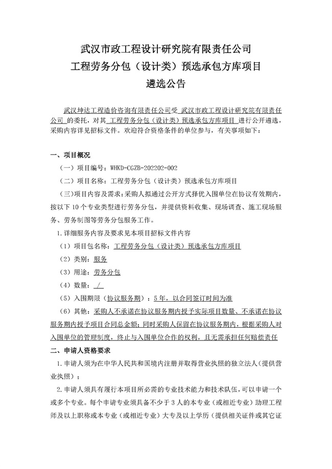 武漢市政工程設(shè)計研究院有限責任公司工程勞務(wù)分包(設(shè)計類)預(yù)選承包方庫項目遴選公告