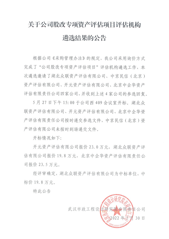 關(guān)于公司股改專項資產(chǎn)評估項目評估機(jī)構(gòu)遴選結(jié)果的公告