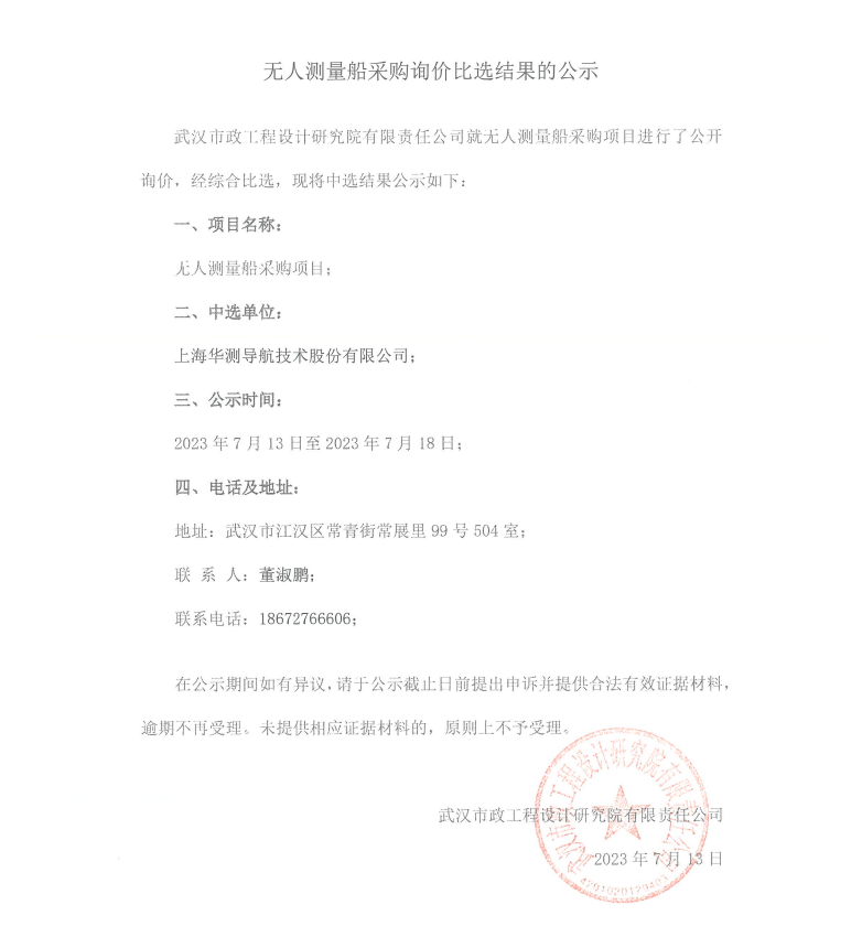 無(wú)人測(cè)量船采購(gòu)詢價(jià)比選結(jié)果的公示