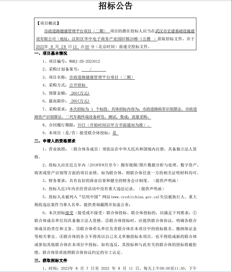 市政道路健康管理平臺項目(二期)招標公告
