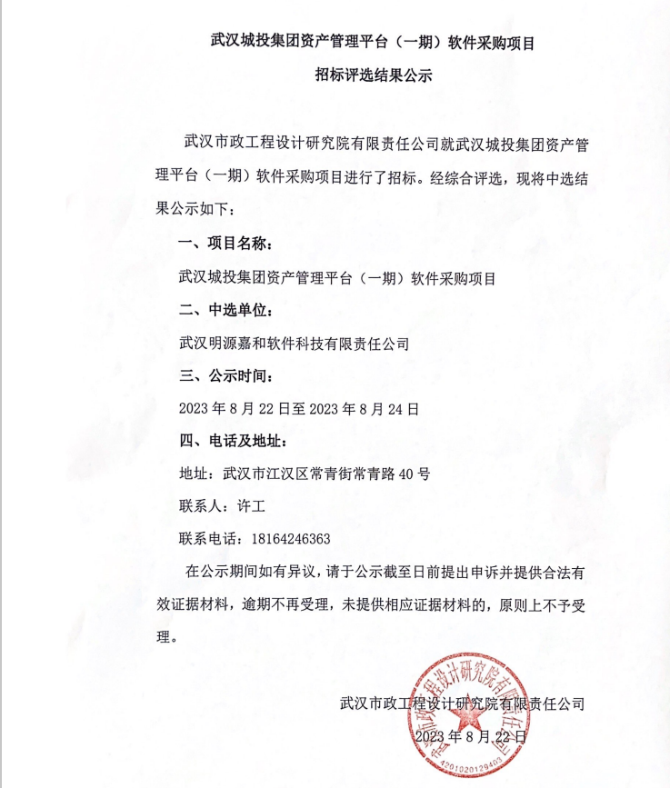 武漢城投集團資產(chǎn)管理平臺(一期)軟件采購項目招標評選結果公示